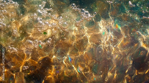 Transparent water waves with air bubbles and sunbeams on transparent background. Vector illustration