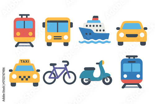 Transport and travel icons set – flat, vacation, urban transportation symbols