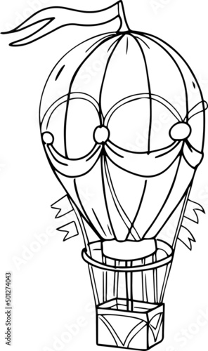 Transport hot air balloon airship car train travel vacation holidays doodle sketch elements hand drawn vector illustration isolated on white background, coloring book for children