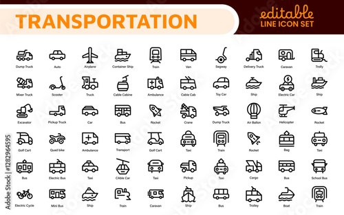 Transport icon set. Containing distribution, shipping, transportation, delivery, cargo, freight, route planning, supply chain, export and import icons. Solid icon collection.