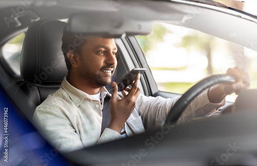 transport, people and technology concept - smiling indian man or driver driving car and recording message using voice command recorder on smartphone
