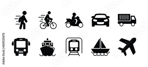 Transportation flat icon set. Transport icon collection. Containing walk, bicycle, motorcycle, motorbike, train, car, truck, aeroplane, plane, bus, ship, sailboat, and aircraft for delivery