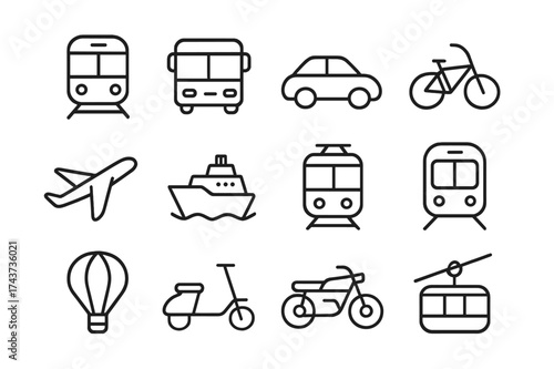 Transportation Icon Set. Transportation. Line icon set of transportation: train, bus, car, bicycle, airplane, ship, tram, metro, hot air balloon, scooter,