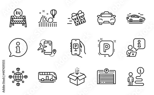 Transportation icons set. Included icon as Flights application, Parking app, Parking signs. Bus tour, Logistics network, Get box symbols. Taxi, Car, Eu close borders. Present delivery. Vector