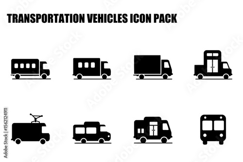 Transportation vehicles icon set of various types of trucks, buses, and vans. Side profile view of different commercial vehicles.