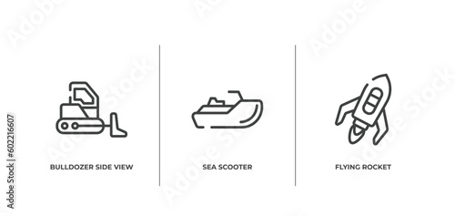 transporters outline icons set. thin line icons sheet included bulldozer side view, sea scooter, flying rocket vector.