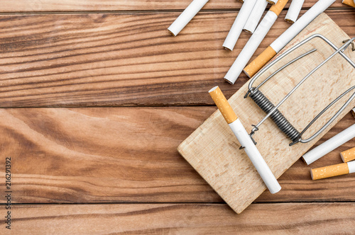 Trap with cigarettes on wooden table. Top view.