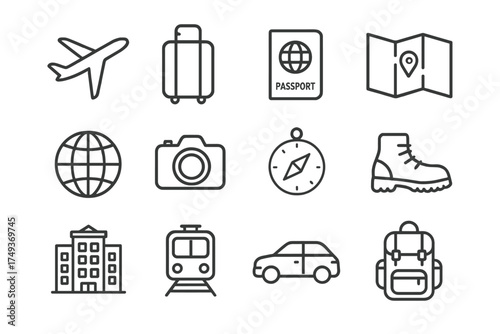 Travel Adventure Icons. Traveling and exploring new destinations. Line outline icon set of Traveling and