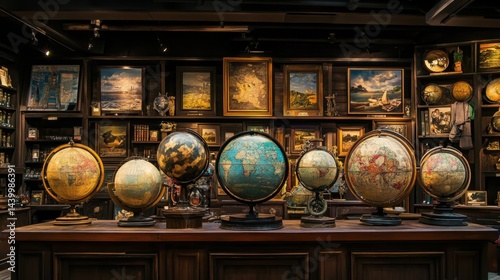 Travel agency themed decor with globes, maps, and framed travel posters on walls