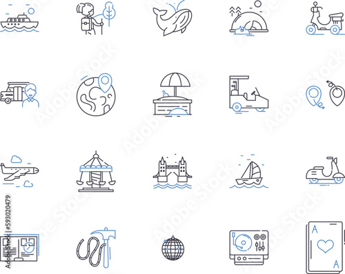 Travel and leisure outline icons collection. Vacation, Tour, Adventure, Sightseeing, Explore, Holiday, Recreation vector and illustration concept set. Exploring, Cruise, Bike linear signs
