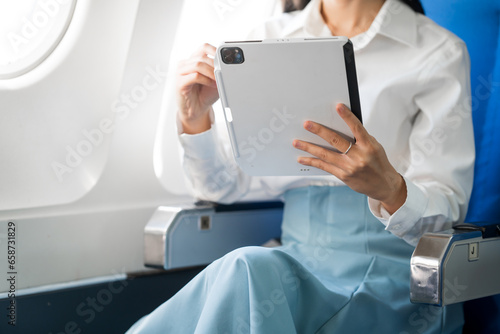 travel and technology Fly in first class Beautiful Asian businesswoman working using laptop computer while sitting on airplane