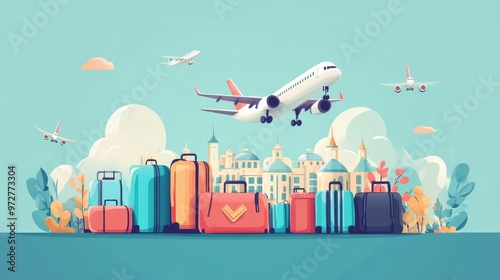 Travel and tourism concept, ravel bag with plane, Airplane flying above tourists luggage, Illustrator Artwork