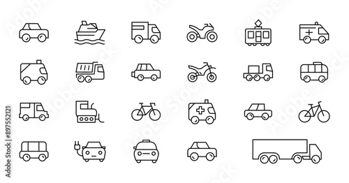 Travel and Transport line icon set. Containing car, bike, plane, train, bicycle, motorbike, bus and scooter icons. Transportation Simple line icon collections