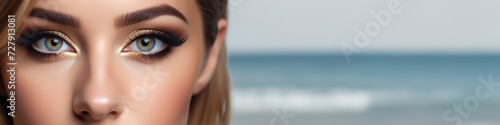 Travel and vacation copy space banner. Beautiful face of young caucasian girl with natural make-up, perfect skin and brown eyes isolated. Portrait of beautiful young woman with ocean background