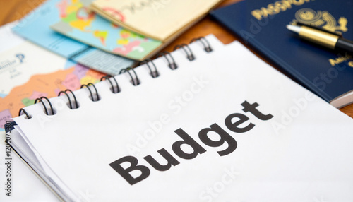 Travel budget planning with notebook, maps, passport, and pen on wooden table