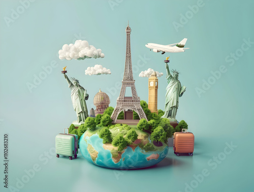 Travel Concept with Plane on Famous Landmark and Historical Places, 3d Airline Ticket, Travel Bag, Globe and Airplane. Render Paper Ticket with Plane Icon, Suitcase and Planet Earth. Travel Element.