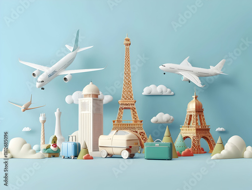 Travel Concept with Plane on Famous Landmark and Historical Places, 3d Airline Ticket, Travel Bag, Globe and Airplane. Render Paper Ticket with Plane Icon, Suitcase and Planet Earth. Travel Element.