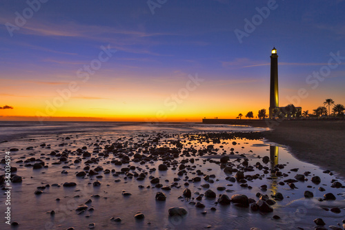 Travel Destinations. Lighthouse of Maspalomas At Gran canaria Island Known as Faro de Maspalomas at Sunset During Blue Hour