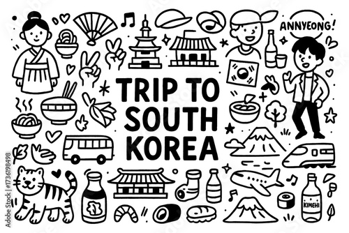 travel doodle composition with south korea culture icons and traditional holiday elements, Transparent Background