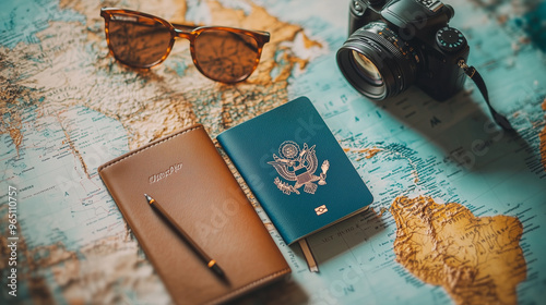 Travel Essentials Flat Lay with Passport, Sunglasses, and Map