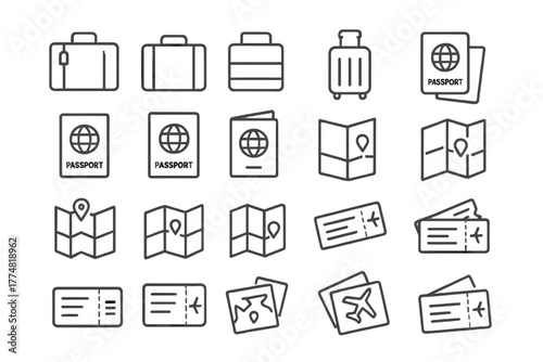 Travel Essentials Icon Set – Luggage, Passport, Map, and Ticket Symbols on Dark Background