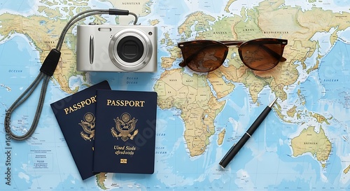 Travel essentials including passports, a camera, sunglasses, and a map are laid out