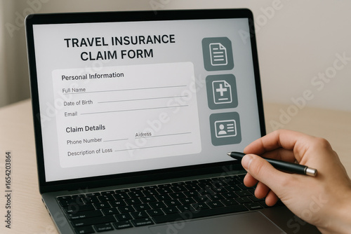 Travel insurance claim form on laptop screen with hand holding pen for filling details
