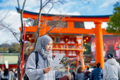 Travel, muslim, Two Asian female tourists of different religions friends visitor learning about history of fushimi inari shrine in travel book while walking through senbon torii path in Kyoto Japan.