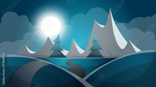 Travel night cartoon landscape. Tree, mountain, comet, star, moon road illustration Vector eps 10