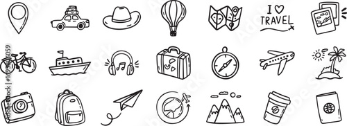 Travel Outline Vector – Hand Drawn Tourism Icons, Luggage, Airplane, Globe, Adventure Doodles, Minimal Black and White Clipart, Isolated Sketch