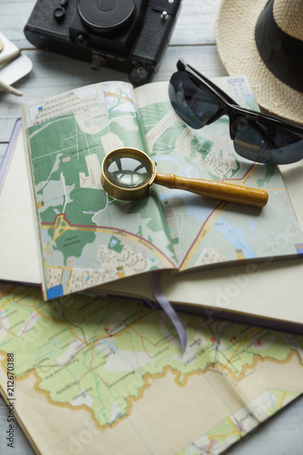 Travel planning concept, notebook, map, documents, hat, camera, accessories for trip, outfit of traveller, tourist making his notes, selective focus