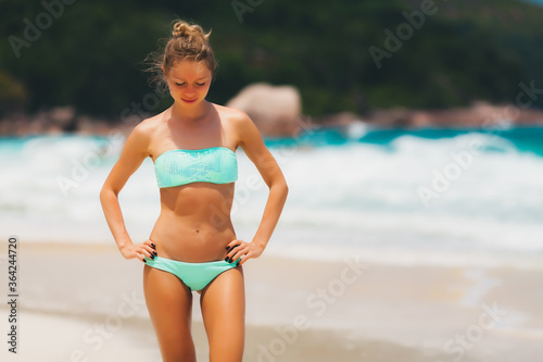 travel vacation wallpaper - Beautiful young pretty blonde girl in white bikini with white sand on her perfect sport sexy body relax in sea of white sand paradise tropical Maldives beach at sunny day
