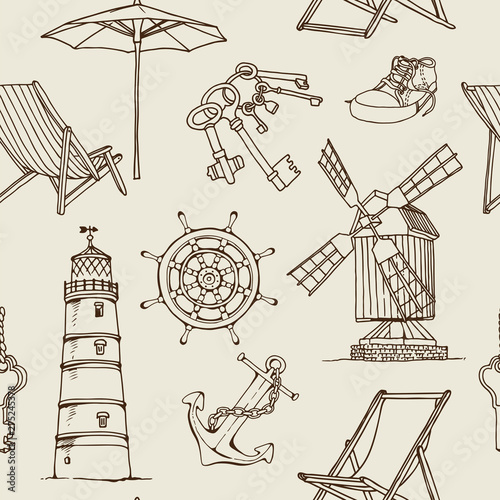 Travel vector seamless pattern, hand drawn sketch background isolated on vintage beige background