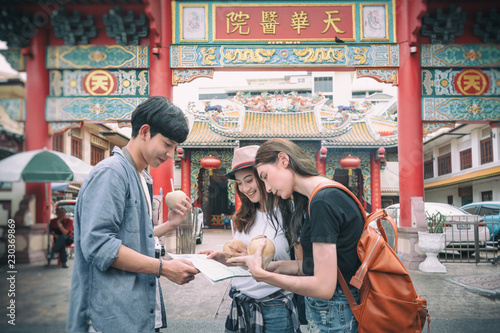 Traveler are discussing about theirs trip at the front of Kuan Yim Shrine ( chinese text) Chinese Temple in Thailand