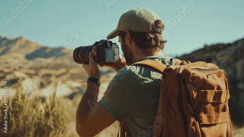 Traveler documenting their adventures with camera. Tourist exploring their travels in a picturesque