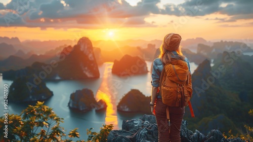 Traveler Enjoying Stunning Sunset View Over Ha Long Bay