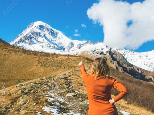 Traveler girl points to the top of the mountain, standing back. Travel lifestyle, holiday vacation concept