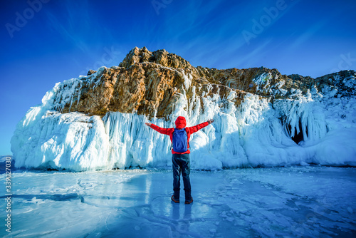 Traveler man wear red clothes and raising arm standing on natural breaking ice in frozen water at Lake Baikal, Siberia, Russia.
