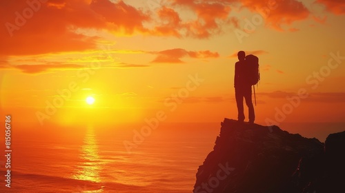 Traveler with backpack silhouetted against setting sun on cliff edge, realistic portrait style, vibrant sky
