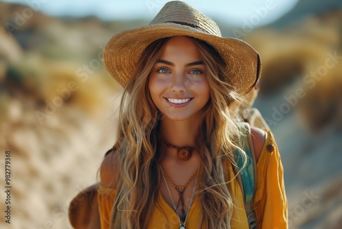 Traveler Woman, Carrying Backpack for Vacation with Desert Landscape Background