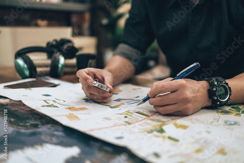 Travelers planning trips and finger pointing on map, or find travel routes. Travel concept.