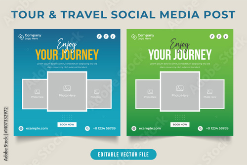 Traveling agency social media post with photo placeholder. Tour and travel web banner template for business promotion. Holiday tour planner advertisement poster design with green and blue colors.