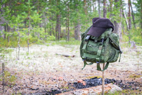 Traveling backpack on top of which is black sun cap hanging on wooden stick in forest.