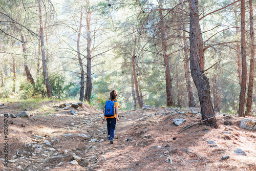 Traveling child. a tourist with a backpack goes along a mountain road. adventure holidays with children.