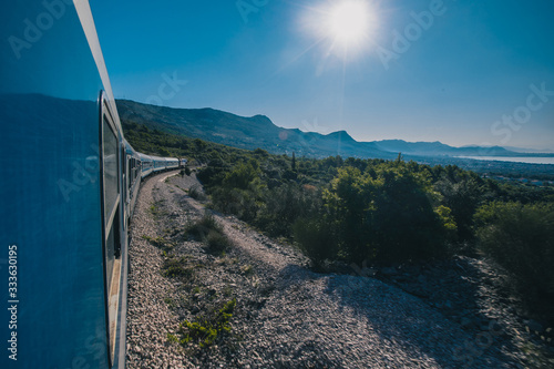 Traveling on a diesel passenger train towards Split, Croatia. View from a window over whole trainset while descending through rock formations above Split and Trogir