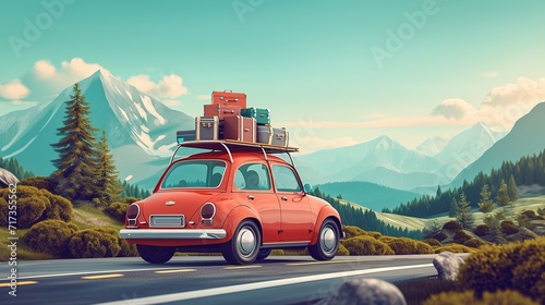 Travelling by car. Retro car with luggage on the roof. Car on the road with a lot of suitcases on roof. Family travel on vacation