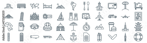 travelling thin line icon set such as pack of simple egypt pyramids, camcorder, diving glasses, phone booth, africa map, duomo di milano, palm on island icons for report, presentation, diagram, web