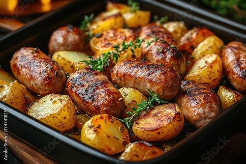 Tray of grilled sausages and roasted golden potatoes garnished with fresh green herbs presenting a warm, savory meal