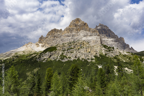 Tre Cime di Lavaredo on a background of clouds. Dolomites. Italy.