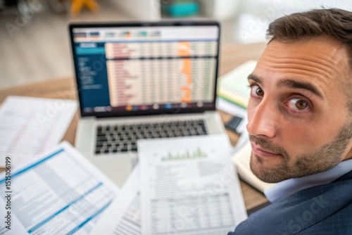 Treasury yields concept. Business professional analyzing data on a laptop surrounded by documents.